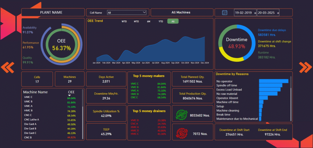 Access shift-wise OEE, downtime patterns, and machine-level trends. Identify gaps in performance and take action without waiting for end-of-day reports.